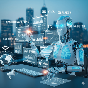 AI tools like ChatGPT and Jasper assist marketers in quickly generating blogs, ads, and social media captions. AI-powered SEO platforms analyze search intent, optimize keywords, and predict which content will perform better. This makes digital marketing strategies more data-driven and effective.