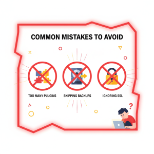 Choose a simple theme and install essential plugins: SEO plugin (e.g., Yoast/Rank Math), caching (if not pre-enabled), and a security plugin.